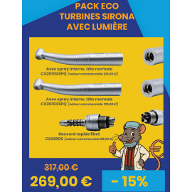 Ce pack promotionnel vous permet de bénéficier de 15.14% de réduction (soit 48,00 € TTC) sur l'achat de 2 tubines dentaires Coxo avec lumière et tête normale compatibles Sirona + 1 raccord rapide Coxo compatible Sirona par rapport à des achats à l'unité.
